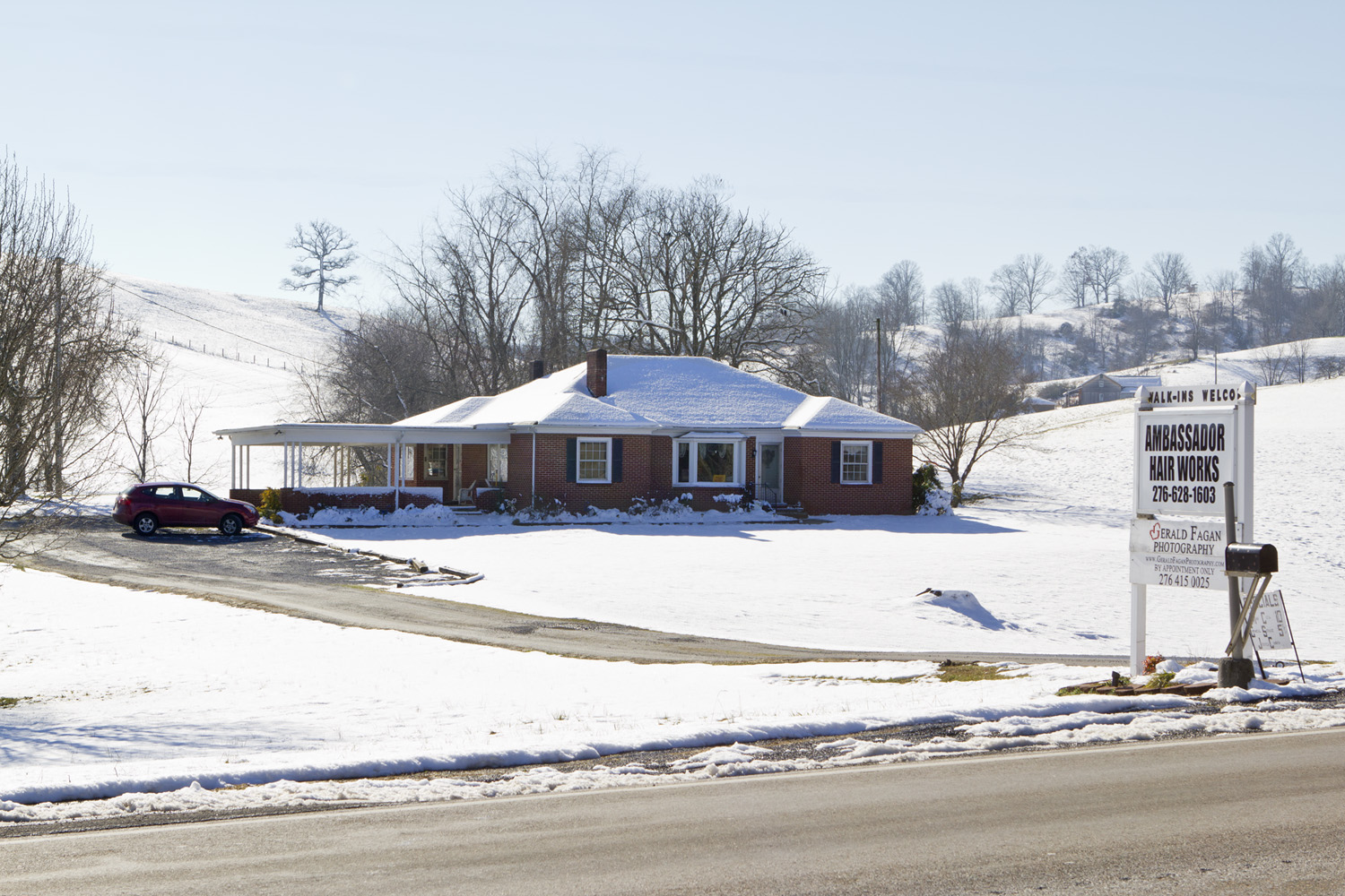 It is a red brick house that is shared with Ambassador Hairworks.